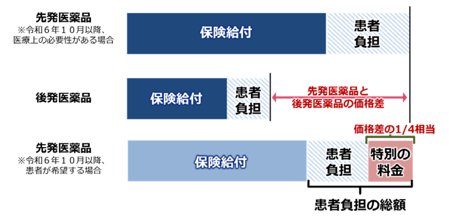 令和6年10月から、後発医薬品(ジェネリック医薬品)があるお薬で先発医薬品を希望される場合、通常の自己負担に加えて特別料金をお支払いいただきます。